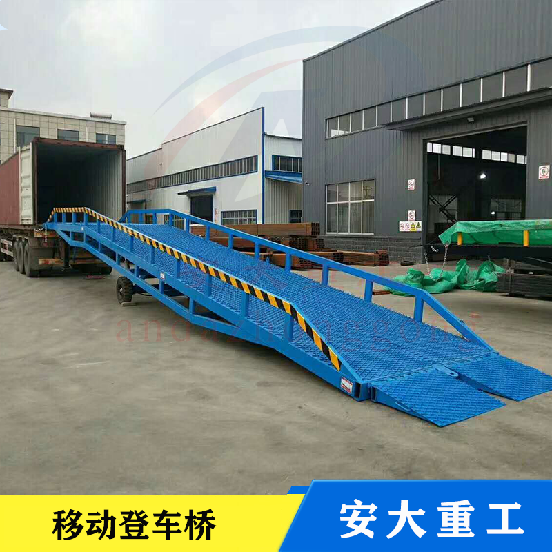 移動式登車橋式與叉車配合使用的貨物裝卸輔助設備,可根據汽車車廂的高低調節(jié)高度,叉車可以直接通過本設備駛入車廂內部機制進行貨物的批量裝卸,僅需單人作業(yè)即可實現貨物的快速裝卸